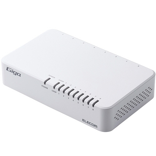 ●音が静かなファンレス設計で、ループ検知機能も搭載した1000BASE-T対応の電源外付けプラスチック筐体8ポートハブ、本体色はホワイトです。