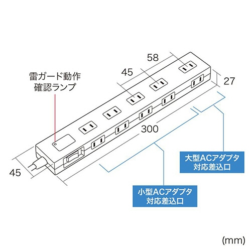 商品仕様 | ●色/ブラック ●コンセント仕様/2P・シャッター付き ●コンセント数/10個口 ●プラグ形状/2P絶縁キャップ付きスイングプラグ ●定格容量/15A・125V(1500Wまで) ●ケーブル長さ/5m ●最大サージ電圧/2500A ●制限電圧/775V ●雷ガード/あり ●一括集中スイッチ/あり ●ブレーカー/あり ●寸法/W300×D45×H27mm ●質量/約786g ●その他仕様/●差込口間隔:45mm(1個口だけ58mm間隔があります) ●マグネット:あり ●コード:VFF1.8スケア(SQ)×2心、仕上り外形寸法/約4.2mm×7.6mm ●バリスタ電圧:470V |