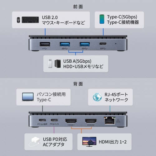 ●USB Type-Cケーブル1本でディスプレイ最大2台へ映像出力ができる、HDMI映像出力端子を2ポート搭載したコンパクトなUSB Type-Cドッキングステーションです。
