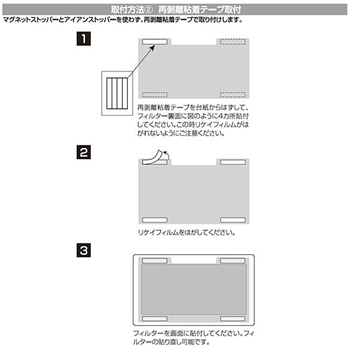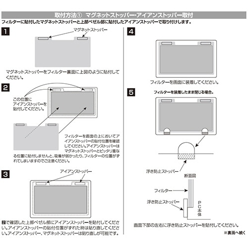 | 商品仕様 | ●対応サイズ/16型(16:10) ●反射率/約1.5% ●可視光線透過率/約65% ●厚さ/約0.4mm ●のぞき見防止/対応 ●寸法/W345×D×H222mm ●その他仕様/●視認角度:60° ●プライバシー保護 ●ブルーライトカット率:約40%(ブルーライトを含む全波長域において。) ●付属品/フリーカット可能アイアンストッパー×2枚、フリーカット可能フェライト系マグネットストッパー×2枚、浮き防止ストッパー×2個、再はく離粘着テープ×4枚 ●備考/※マグネット使用時はマグネット取付部(上部べゼル幅)が6mm以上必要です。 |