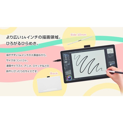 ●Wacom One は、描きやすい14 型の大画面ながら、サイズはコンパクト。マンガやイラスト、アニメ、スケッチなどの創作にぴったりのサイズです。
