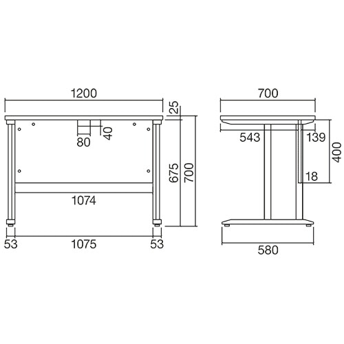 ●机と幕板には電源やLANコードが通せる孔を用意、机を隙間なく合わせられる。