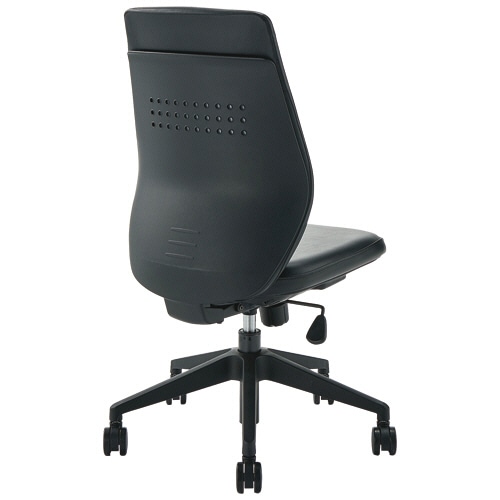 ●防汚で高級感のあるPVCレザー仕様。座面は長時間座っても疲れにくいモールドウレタンを使用したハイバックのオフィスチェアー。本体色はブラックです。