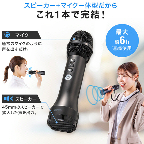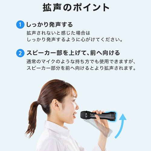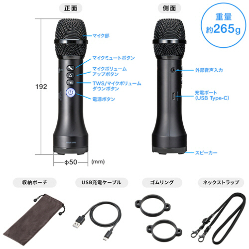 | 商品仕様 | ●寸法/W約50×D50×H192mm ●質量/約265g ●ワイヤレス機能/Bluetooth5.3 ●電源/内蔵リチウムイオン電池(容量3200mAh)、またはUSBポー トより給電(DC5V 1A) ●その他仕様/●連続使用時間:約6時間 ●充電時間:約4~5時間 ●保証期間:6ヵ月 ●付属品/USB充電ケーブル×1、ネックストラップ×1、ゴムリング×2(1個は本体に装着済)、収納ポーチ |