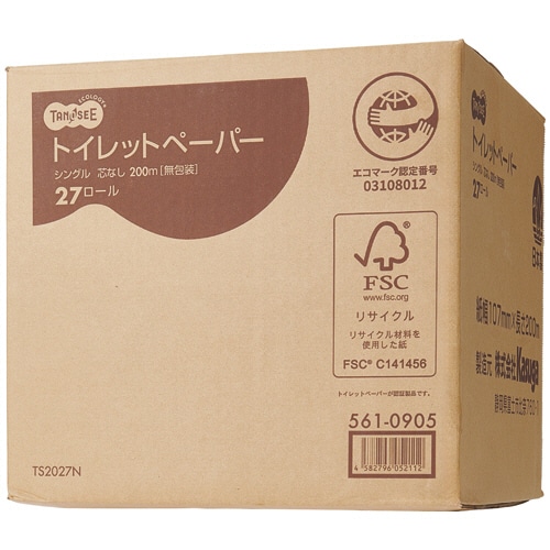 | 商品仕様 | ●タイプ/シングル ●ロールサイズ/幅107mm×長さ200m ●ミシン目/なし ●芯/なし(通常のホルダーにセットできます。) ●芯径/約36±2mm ●材質/再生紙100% ●生産国/日本 ●その他仕様/●ケースサイズ:356×356×H333mm ●直径:約115mm ●シリーズ名/TANOSEE(エコロジー) |