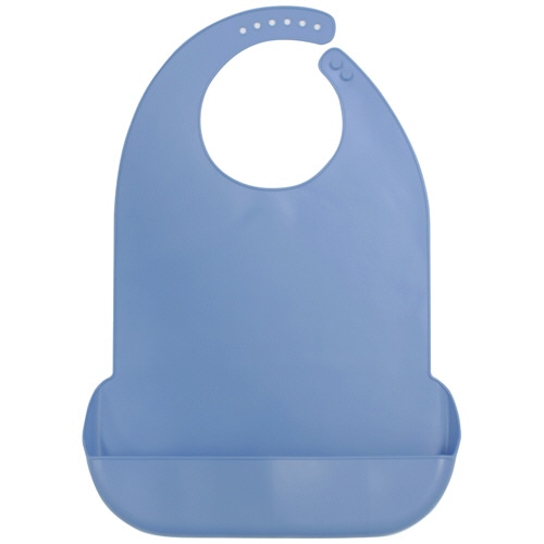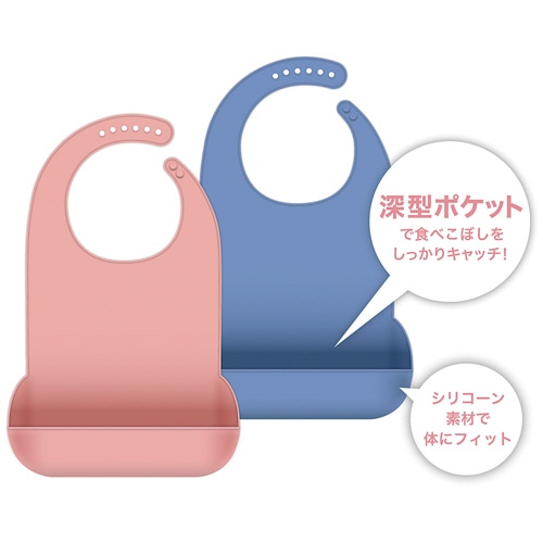 ●深型ポケットで食べこぼしをしっかりキャッチする食事用エプロン。色はブルーです。