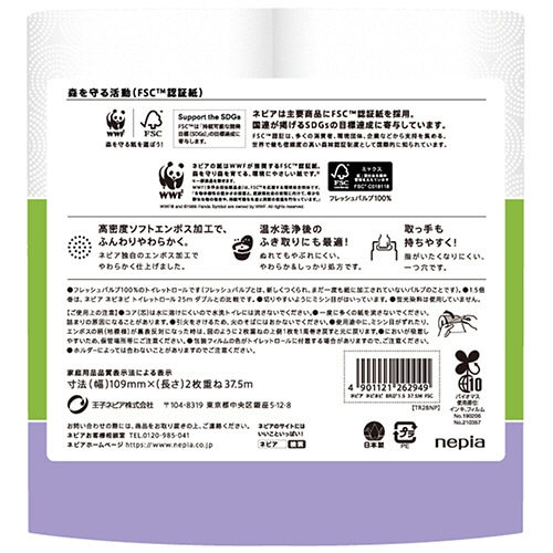 | 商品仕様 | ●タイプ/ダブル ●ロールサイズ/幅109mm×長さ37.5m ●ミシン目/あり ●香り/無香料 ●芯/あり ●重量/1030g ●材質/フレッシュパルプ100% ●パッケージサイズ/W約228×D216×H222mm ●生産国/日本 ●シリーズ名/ネピア |