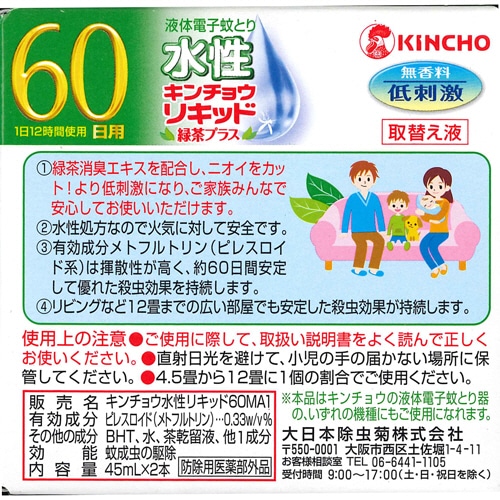 | 商品仕様 | ●本体・付替/付替 ●効果/駆除 ●対象害虫/蚊成虫 ●効果範囲/12畳 ●使用可能日数/60日用 ●内容量/45ml ●香り/無香料、緑茶プラス ●有効成分/ピレスロイド(メトフルトリン) ●備考/※内容量は1本あたり ●シリーズ名/キンチョウリキッド |