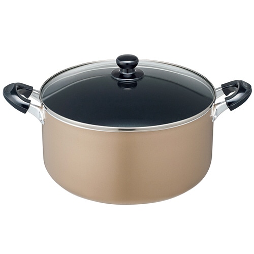 | 商品仕様 | ●種類/両手鍋 ●容量/10.3L ●外寸/W438×D310×H221mm ●外 寸/直径30×高さcm ●対応熱源/IH ●色/ゴールド系ブラウン ●材質/本体:アルミニウム合金、底面:ステンレス鋼(底の厚さ/2.8mm)、内側:フッ素樹脂加工、外面:焼付塗装、ハンドル・蓋ツマミ:フェノール樹脂、蓋:強化ガラス ●重量/2230g |