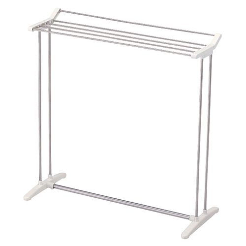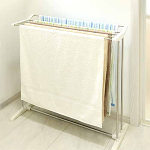 | 商品仕様 | ●寸法/W765×D320×H800mm ●干す量の目安/大判バスタオルの場合約5枚、フェイスタオルの場合約10枚 ●重量/1.2kg ●耐荷重/5kg ●材質/樹脂部分:ABS、パイプ:ステンレスパイプ、ネジ部:スチール |