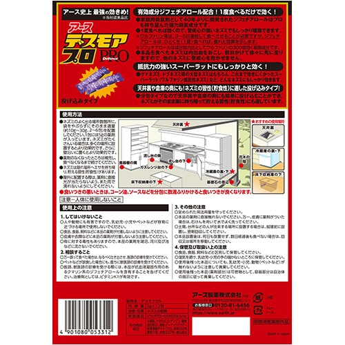 商品仕様 | ●タイプ/投げこみタイプ ●効果/駆除 ●対象害虫/ネズミ ●内容量/5g ●その他仕様/●防除用医薬部外品 ●備考/※内容量は1包あたり ※販売名:デスモアD5 |