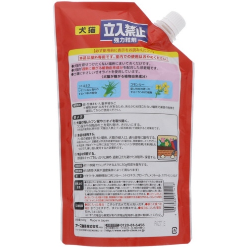 | 商品仕様 | ●効果/忌避 ●効果範囲/庭・花壇・家のまわり・駐車場等 ●内容量/600g ●使用可能日数/約2週間持続(散布場所や天候により異なります) ●有効成分/ゼオライト、植物精油(コモンルー、シトロネラ、クローブ)、メントール、カプサイシンなど ●備考/※自動車や塗装したもの、金属、プラスチックは損傷する場合があるので使わないこと。 ※植物には直接散布しないでください。変色および枯れる恐れがあります。 |