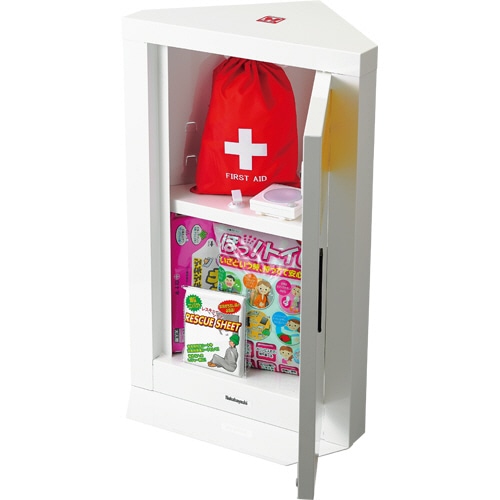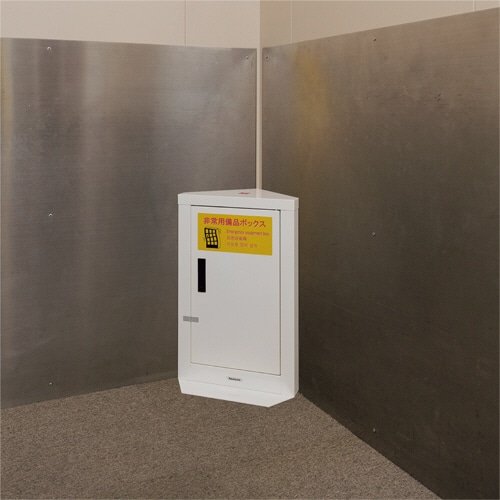 エレベーターに閉じ込め事故発生時に必要とされる商品を収納できるコーナー設置タイプのエレベーター防災キャビネット