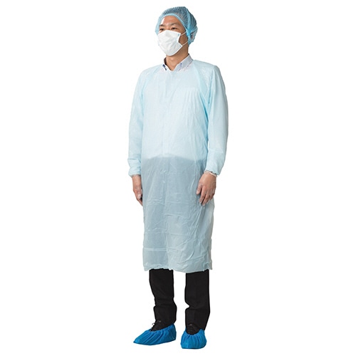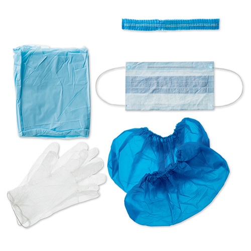 | 商品仕様 | ●その他仕様/●セット内容:不織布ヘアキャップ棒状(ブルー)×1枚、3層式マスク(ブルー)×1枚、PE袖付エプロン(ブルー)×1枚、プラスチック手袋×2枚、PEシューズカバー(ブルー)×1足 |