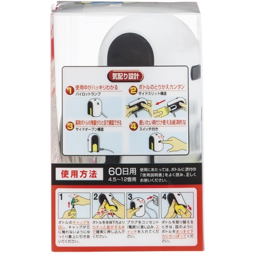 | 商品仕様 | ●本体・付替/本体+付替 ●用途/お部屋用 ●効果範囲/4.5~12畳 ●使用可能日数/60日 ●香り/無香料 ●サイズ/本体:W65×D68×H99mm ●セット内容/器具1個、薬剤1本 ●その他仕様/●コード長:80cm ●防除用医薬部外品 ●シリーズ名/ノーマット |