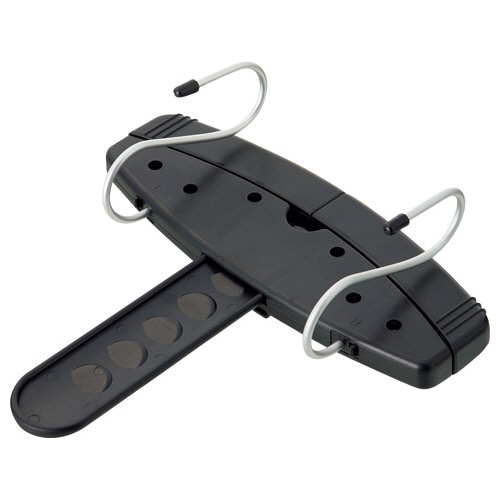 商品仕様 | ●色/ブラック ●材質/ハンガー:ABS、ホルダー:アルミ、キャップ:特殊エラストマー ●その他仕様/●サイズ:閉じた状態:縦240×横260×幅23mm、アームを伸ばした状態:縦390×横443×幅23mm |