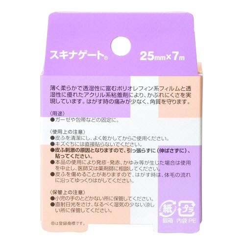 ●サイズは25mm×7m、フィルムタイプの極低刺激テープ。