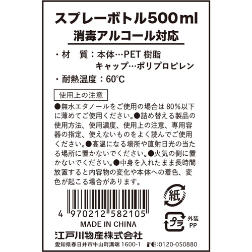 | 商品仕様 | ●容量/500ml ●材質/本体:PET樹脂、キャップ:ポリプロピレン ●耐熱温度/60℃ ●その他仕様/●生産国:中国 ●備考/※無水エタノールをご使用の場合は80%以下に薄めてご使用ください。 |