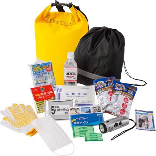 | 商品仕様 | ●セット内容/ドライバッグ20L、不織布マスク、救急絆創膏、三角巾、LEDパームラジオ、滑り止め付軍手、ウェットティッシュ、簡易トイレ2個、アルミシート、緊急呼子笛、ポケットレインコート、非常用クッキー(チョコ)2個、保存水500ml、サブバッグ(反射テープ付) ●保存期間(月数)/60 |