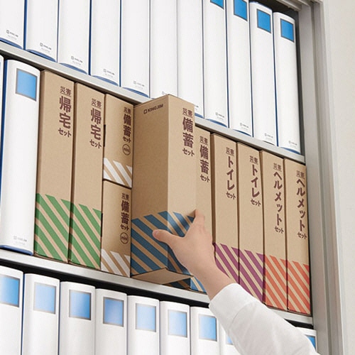 ●個人で保管しやすく、もしもの時も、すぐそばに。書棚や引き出しに収納しやすいので、配布の手間が少なく、個人単位で早い対応が可能です。