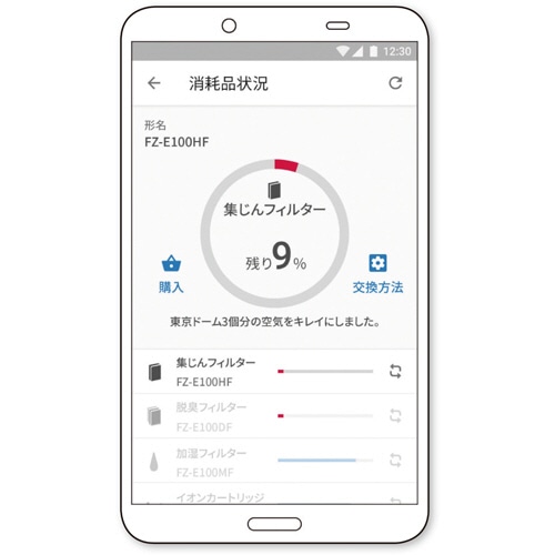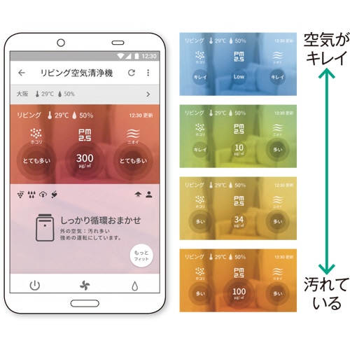 ●表示モニターで現在のお部屋の温度・湿度・PM2.5濃度・電気代(目安)をお知らせ。