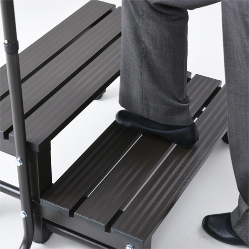 商品仕様 | ●段数/2段 ●重量/約6.0kg ●耐荷重/80kg ●材質/踏み台:アルミニウム、取っ手:スチール(表面加工:ポリエステル塗装) ●色/ダークブラウン ●その他仕様/●サイズ:W64.6×D53×H118cm(取って含むW81.5cm) ●ステップの高さ:[1段目]16.5cm、[2段目]32cm |