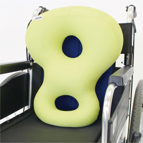 ●逆向きでのご使用も!深く座り、背すじをのばす8の字クッションと背中を密着させると、車イスでは背もたれのない肩甲骨周辺まで広く支えることができます。