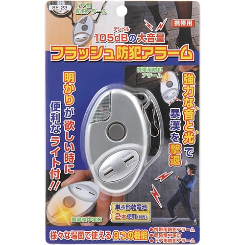 | 商品仕様 | ●音量/約105dB ●電源/単4形乾電池×2本(別売) ●電池寿命/ライト:連続約60分間、アラーム:連続約45分間 ●寸法/W45×D31×H75mm ●重量/約38g ●色/シルバー ●その他仕様/●ライト光源:ミニチュア球(交換不可) ●保証期間:1年 ●備考/※電池は別売りです。 |