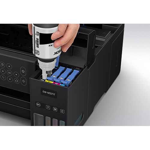 ●「挿すだけ満タン」インク方式を採用。スクリュー式のキャップを開けて挿すだけで、カンタンにインク補充が開始。満タンになると自動的に補充が完了するので、手も汚れにくく、手間がかかりません。また、タンクとインクボトルの注入口の形状が色ごとに異なるので、入れ間違いも起こりません。
