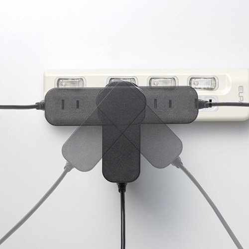 ●コンセントプラグが180°回転する、180°回転プラグ機構を採用しています。プラグを回転させることで、どんな向きのコンセント挿し込み口でも挿すことができます。タテ・ヨコどちら向きの電源タップに挿しても、隣のコンセント口と干渉することなく使用できます。