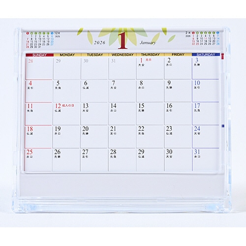| 商品仕様 | ●タイプ/卓上 ●寸法/タテ125×ヨコ148mm ●枚数/15枚(表紙+1~12月:13枚、ホワイトボード用シート/フォトスタンド用シート:1枚、使用説明シート:1枚) ●始まり曜日/日曜 ●表示内容/六曜 ●材質/用紙:マットコート紙、ケース:スチロール樹脂 ●重量/125g ●製造国/中国 ●その他仕様/●個装形態:紙袋包装 |