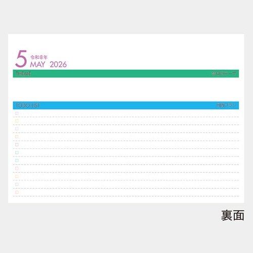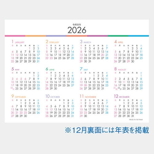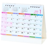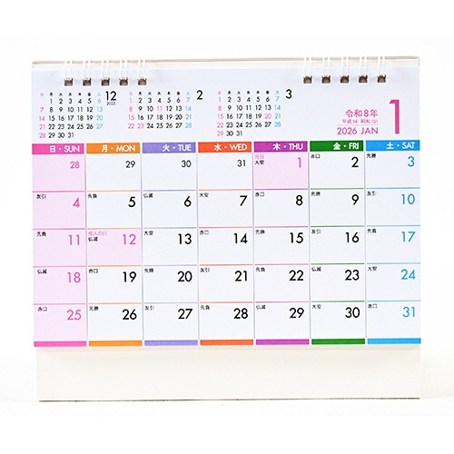 ●表面は広いメモスペースで曜日欄は7色を使い、休日のマスは淡いピンクで分かりやすく表示した卓上カレンダーです。
