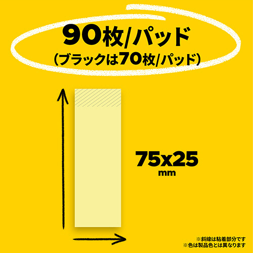 | 商品仕様 | ●寸法/25×75mm ●粘着側/短辺 ●色/ブラック ●粘着力/強粘着 ●材質/本体:紙、粘着剤:アクリル系粘着剤 ●重量/30g ●1パックあたり/70枚×2冊 ●備考/※重量はパッケージ重量。 ※強粘着タイプですので、貼り付けた面の状態によっては貼り付け表面を傷つけたり、貼り跡もしくは粘着材が残る恐れがあります。 ●シリーズ名/Post-it ●カラー/ブラック(系) |