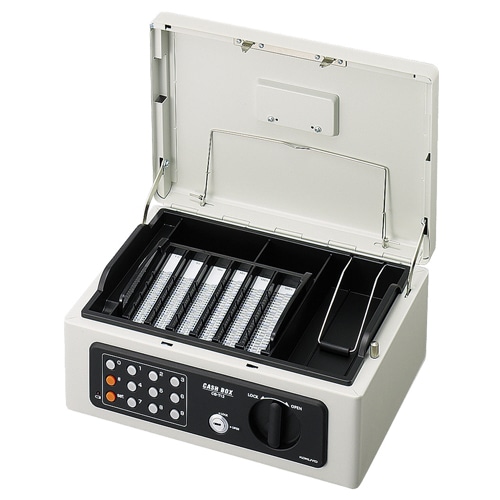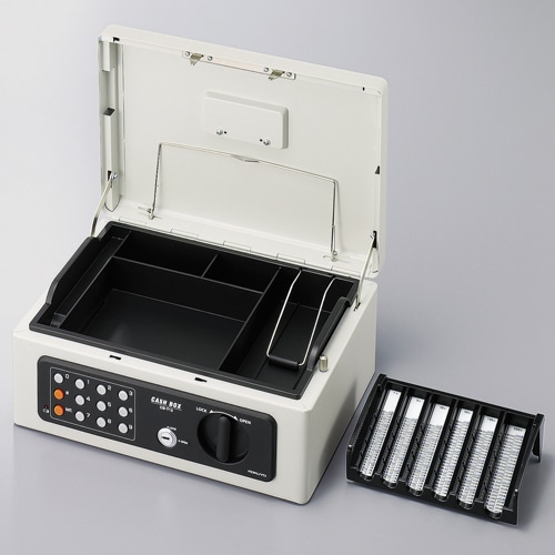 商品仕様 | ●サイズ/B5 ●色/ライトグレー ●コイン収納枚数/500円:50枚、100円:50枚、50円:50枚、10円:50枚、5円:50枚、1円:50枚 ●施錠方法/テンキー、シリンダー錠 ●内寸/W276×D202×H62mm ●外寸/W313×D229×H130mm ●電源/単4形乾電池2個 ●材質/本体:鋼板(焼付塗装)、前面パネル:ABS、トレー:R-ABS ●付属品/鍵2個、単3形乾電池4本(お試し用) ●その他仕様/●フタハネ上げ調節付き ●書類押さえ(フタ裏)付き |