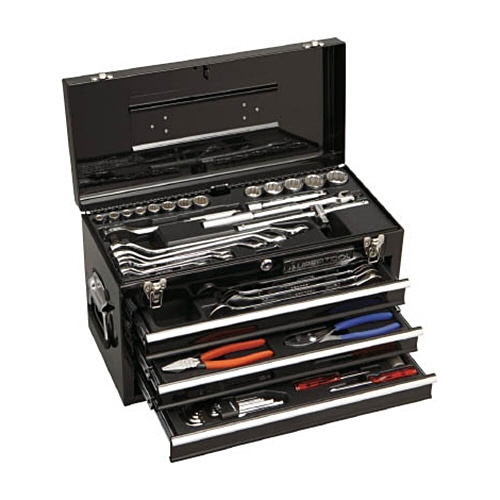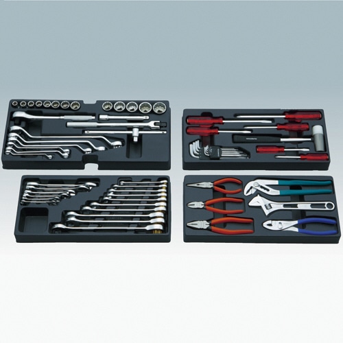 | 商品仕様 | ●セット内容/ソケット12角(差込角12.7mm)×13個、ラチェットハンドル(プッシュ式)、エクステンションバー、ナットスピンナハンドル、T型スライドハンドル、ギアレンチ(スタンダードタイプ)×10本、45°両口めがねレンチ×6本、両口スパナ×6本、貫通角軸ドライバー×6本、ワイドモンキーレンチ、コンビネーションプライヤー、ウォーターポンププライヤー、ペンチ、ラジオペンチ、ニッパー、ロングボールポイント六角棒レンチ9本セット、コンビネーションハンマー、ツールチェスト ●ケースサイズ/W505×D233×H300mm ●重量/19.7kg ●色/ケース:ブラック |