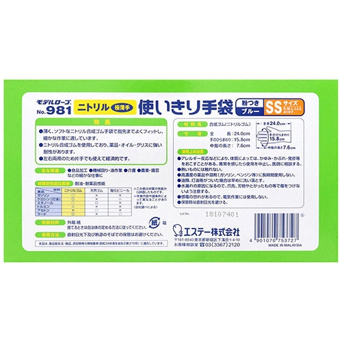エステー モデルローブ No.981 ニトリル使いきり手袋(粉付) SS ブルー 1箱(100枚)