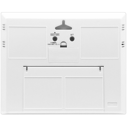 商品仕様 | ●測定項目/温度、湿度 ●表示項目/温度、湿度、時計 ●設置方法/卓上・壁掛兼用 ●測定温度範囲/-9.9~50℃ ●測定湿度範囲/10~99% ●測定温度精度/0~40℃:±1℃(その他の範囲:±2℃) ●測定湿度精度/50~80%:±5%(その他の範囲:±10%) ●寸法/W220×D18×H180mm ●重量/約424g ●色/ホワイト ●電源/単4形アルカリ乾電池×2本 ●付属品/お試し用単4形アルカリ乾電池×2本 ●その他仕様/●保証期間:1年 |