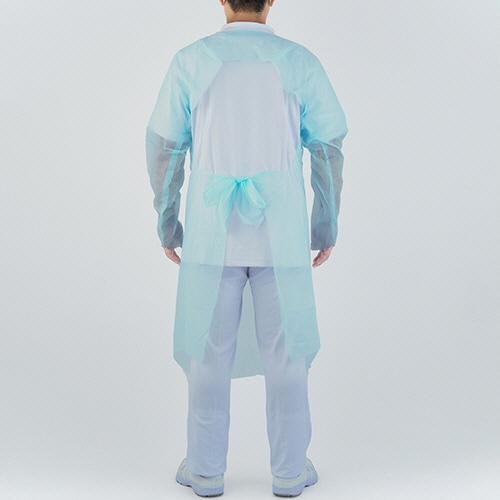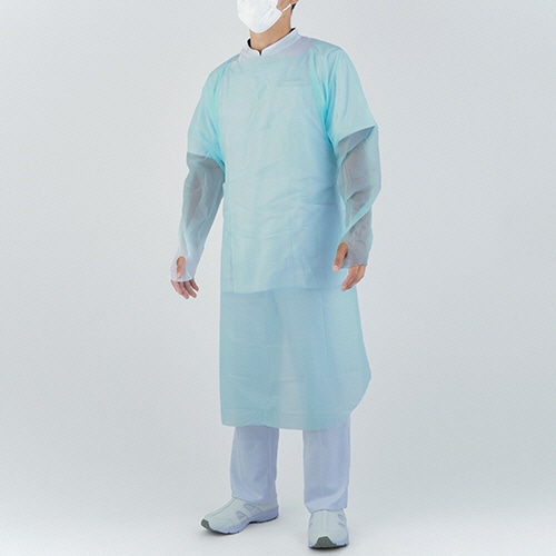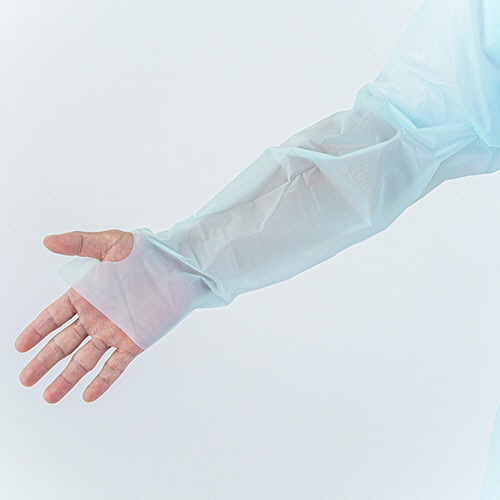 防水性が高い使い捨てプラスチックガウン。エンボス加工でまとわりつきにくく、手首の露出を防ぐ親指フックタイプ。
