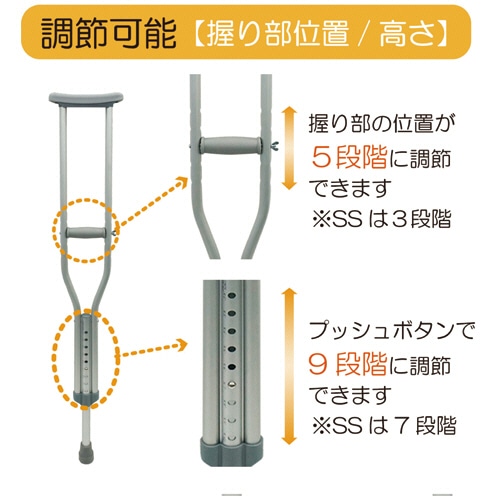 | 商品仕様 | ●調節/握り部調節:5段階、高さ調節:9段階 ●重量/760g ●材質/本体:アルミニウム・PP、横木カバー・握部スポンジ・杖先ゴム:TPR ●その他仕様/●サイズ:S ●対応身長(目安):137~157cm ●備考/※重量は1本あたり |