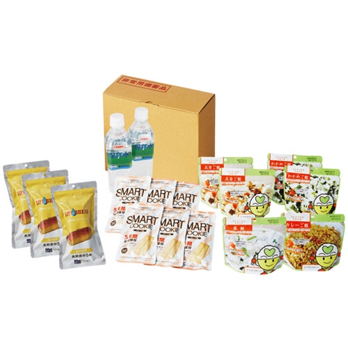 | 商品仕様 | ●セット内容/ライフブレッド(ブリオッシュ)×3袋、スマートクッキープレーン味×6袋、わかめご飯・五目ご飯×各2袋、菜飯・カレーご飯×各1袋、富士山のおいしい水(500ml)×2本(調理用) ●外寸/W315×D125×H260mm ●重量/約2.9kg ●その他仕様/●保存期間:5年 ●備考/※セット内容は1人×3日分 ※飲料用の保存水は別途ご用意いただくことをおすすめいたします。 ※通常ご納品までに、2~3週間かかる場合がございます。また、需要期や非常時の場合、お届けまでに4週間以上かかる場合がありますことをご了承ください。 |