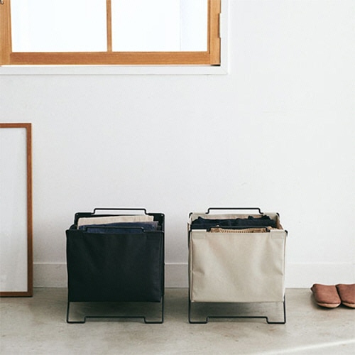 ●一時置きや投げ込み収納にピッタリな「スタックバスケット」。色は黒です。