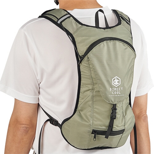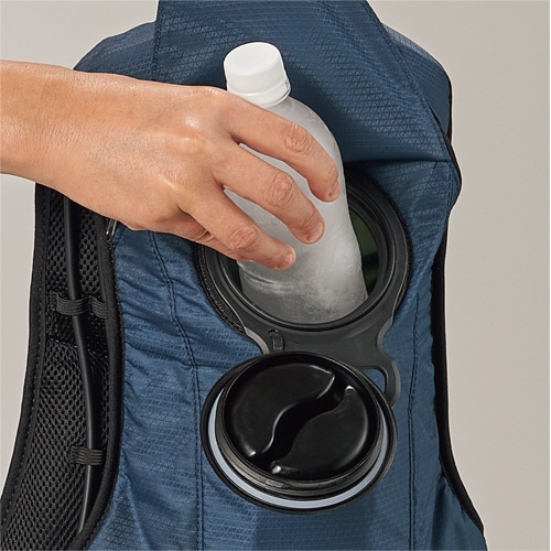 ●着用前に背中のタンクに150mlの水と凍らせたペットボトルを入れるだけ。ポンプで冷えた水を循環させて体を冷やす構造。