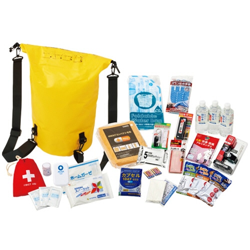 商品仕様 | ●セット内容/ドライバッグ20L、アルミポンチョ、保存水500ml×3、防災用ウェットティッシュ、ポケットティッシュ×2、簡易トイレ(5回分)、救急セット巾着タイプ、クッキー(プレーン、チョコ、抹茶)、ヘッドライト、携帯充電器(テスト用電池付)、充電器用単3アルカリ乾電池 4本パック×2、ホイッスル、スベリ止め付手袋、4way毛布、透明梱包用テープ48mm×15m、折りたたみウォーターバッグ ●備考/※通常ご納品までに、2~3週間かかる場合がございます。また、需要期や非常時の場合、お届けまでに4週間以上かかる場合がありますことをご了承ください。 |