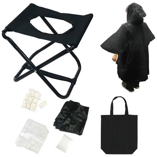 | 商品仕様 | ●セット内容/トイレチェア、凝固剤10個、トイレ用袋10枚、廃棄用袋10枚、ポケットティッシュ1個、ポンチョ1枚、収納バッグ1個 ●使用回数(処理目安)/10回 ●寸法/W330×D70×H420mm ●重量/約1250g ●色/ブラック ●材質/トイレチェア:スチール・ポリエチレン、凝固剤:高分子吸水樹脂 ●備考/※寸法は外箱の値です。 |