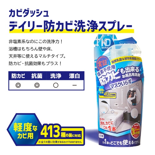 | 商品仕様 | ●洗剤の種類/スプレー ●内容量/300ml ●液性/弱酸性 ●成分/発酵乳酸、有機酸(4%)、防カビ・抗菌剤 ●その他仕様/●用途:浴室の壁・天井・浴槽・床の防カビ、抗菌。 ●香り:無臭 |