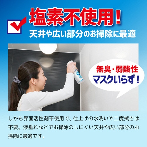 ●非塩素なのでマスクやゴーグルの必要もなく、液垂れが気になる天井や広い部分の掃除に好適。界面活性剤不使用で、仕上げの水洗いや二度拭きは不要。