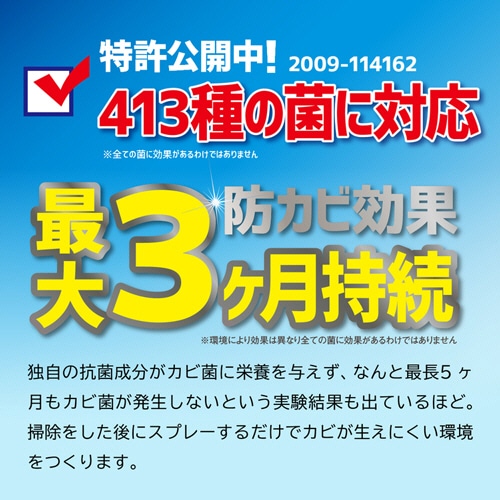 ●メーカー独自の抗菌成分がカビ菌に栄養を与えず、掃除をした後にスプレーするだけでカビが生えにくい環境をつくります。※すべての菌に効果があるわけではありません。