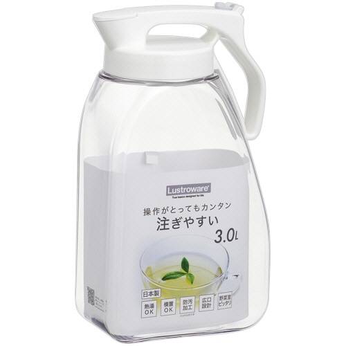 | 商品仕様 | ●容量/3.0L ●寸法/W170×D102×H298mm ●重量/450g ●材質/本体:AS樹脂、フタ:ポリプロピレン、中栓・ロック:ABS樹脂、パッキン:シリコーン |