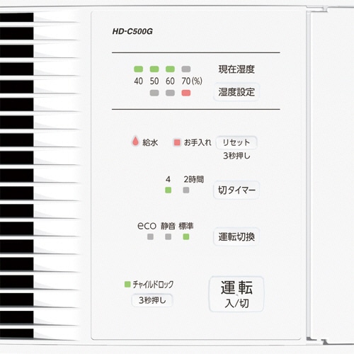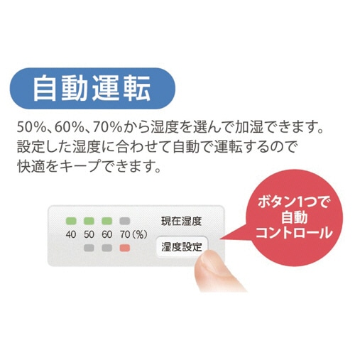 | 商品仕様 | ●加湿方式/ハイブリッド式 ●適用床面積(プレハブ)/14畳 ●加湿能力/500ml/h ●タンク容量/4L ●連続加湿時間/8時間 ●運転音/約30dB ●消費電力/標準:163W、eco:11W ●寸法/W375×D190×H375mm ●重量/約4.5kg ●色/ホワイト ●その他仕様/●フィルター交換目安:5シーズン(1シーズン6ヵ月、1日8時間運転の場合) ●生産国:日本 ●保証期間/3年 ●備考/※連続加湿時間は標準運転時 ※運転音は最大値 |
