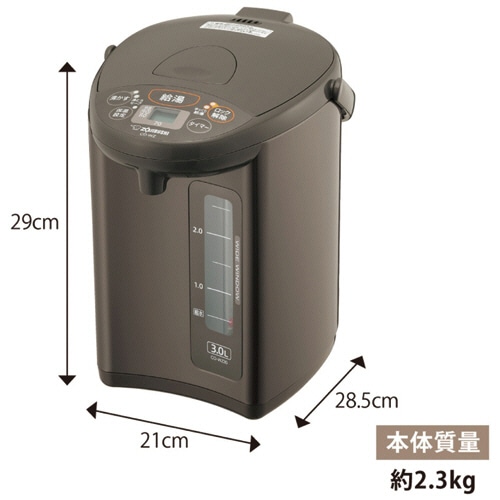 | 商品仕様 | ●容量/3L ●色/メタリックブラウン ●消費電力/700W(沸騰時) ●保温設定(最大)/98・90・80・70℃ ●タイマー/5段階節約タイマー ●寸法/W210×D285×H290mm ●質量/約2.3kg ●その他仕様/●カフェドリップ給湯 ●保証期間/1年 |